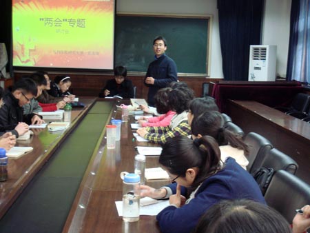 石健同学对于社会建设、房价问题以及人民币升值过快的问题都提出了自己的看法。他认为应该以世界宏观的视角来看待今天中国的问题,应当具有大局观,这样才能更好的把握社会的发展方向,为我国的发展增添新鲜活力。大家分小组讨论,都积极发言,会议气氛十分融洽,大家都感觉到自己身负重任,要更加努力学习,到社会上要多为人民办实事。