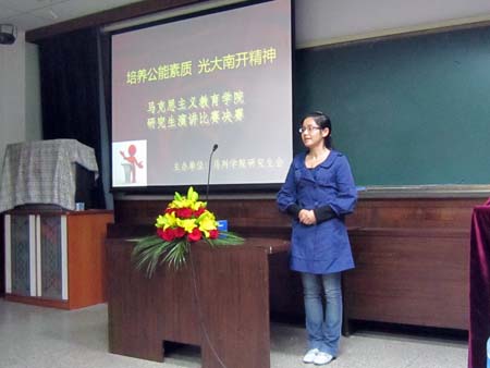 此次决赛是在21日上午进行演讲初赛的基础上进行的,主题为“培养公能素质,光大南开精神”,共有十名选手晋级决赛,决赛分为命题演讲与即兴演讲两部分,即兴演讲部分更是考验马列学子的逻辑思维能力,马列公司硕士研究生今天也来到现场关注此次决赛并为自己的同学加油助威。第一位选手魏娜同学以“没有左蓝的余则成”为题拉开了演讲决赛的帷幕。