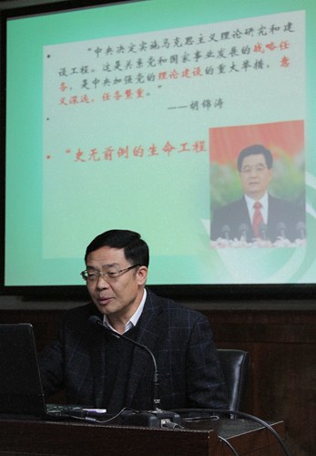 在主报告环节中,作为马工程的知名专家,寇清杰经理主要给大家介绍了近年来马工程研究方面的巨大成就以及其未来的发展趋势。首先,寇经理为大家列举了我国意识形态建构的战略举措。2004年4月27至28日,中央召开工作会议,正式启动马工程,此工程被高度评价为“史无前例的生命工程”,关乎党的生存和发展。2005年设立马克思主义理论一级学科,马工程得到系统和长远的发展。其次,寇经理讲述了马工程八年来取得的阶段性成果,例如,马克思主义经典著作编译取得突破性成果,培养了一大批优秀的马克思主义理论工作者,等等。李长春称此具有“为时代铸魂,为事业固本”的历史意义。最后,寇经理指出:马工程作为牢筑中华民族伟大复兴的思想理论基础,我们青年一代马克思主义理论工作者要深刻认识到深入推进马工程的重大意义。我们要不断加大宣传力度,培育高度的文化自觉和文化自信,增强我国在国际事务中的话语权,以提高整体的文化软实力与竞争力。