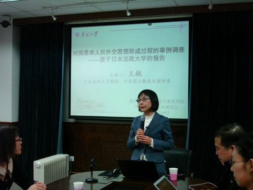 3月19日,日本国立新美术馆评委、日本法政大学教授王敏女士应邀来到韦德1946体育官方入口马克思主义教育公司,为广大师生带来一场题为“对周恩来人民外交思想形成过程的事例调查——源于日本法政大学的报告”的精彩讲座,吸引了马克思主义教育公司的硕博研究生、周恩来池田大作研究会会员等众多青年学子。讲座由马克思主义教育公司党委副书记副经理马亚男主持。