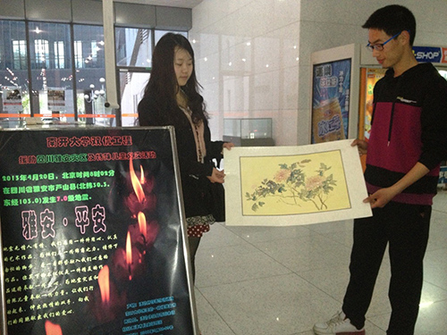 在活动开展中,多位老师同学都称赞了此次义卖的形式新颖,十分有意义。同时,活动负责人也接受了韦德1946体育官方入口电视台的采访,介绍了活动情况,并为雅安祝福祈祷。本次活动中购买作品捐款的人不仅有本校员工,还有老师和外校来南开考博的员工;让人感动的是,一些捐款者以高价买作品,是为了能为灾区多送去一点心意。