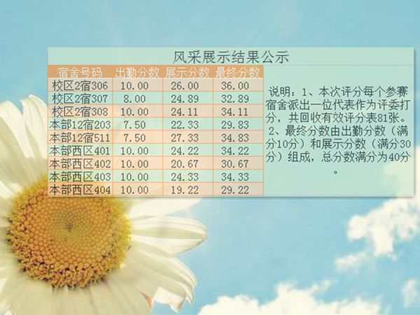 各宿舍选派一名代表组成评委团,从整体效果、基本内容、创意风格、作品制作和现场效果等五个方面对参加展示的宿舍进行评分。