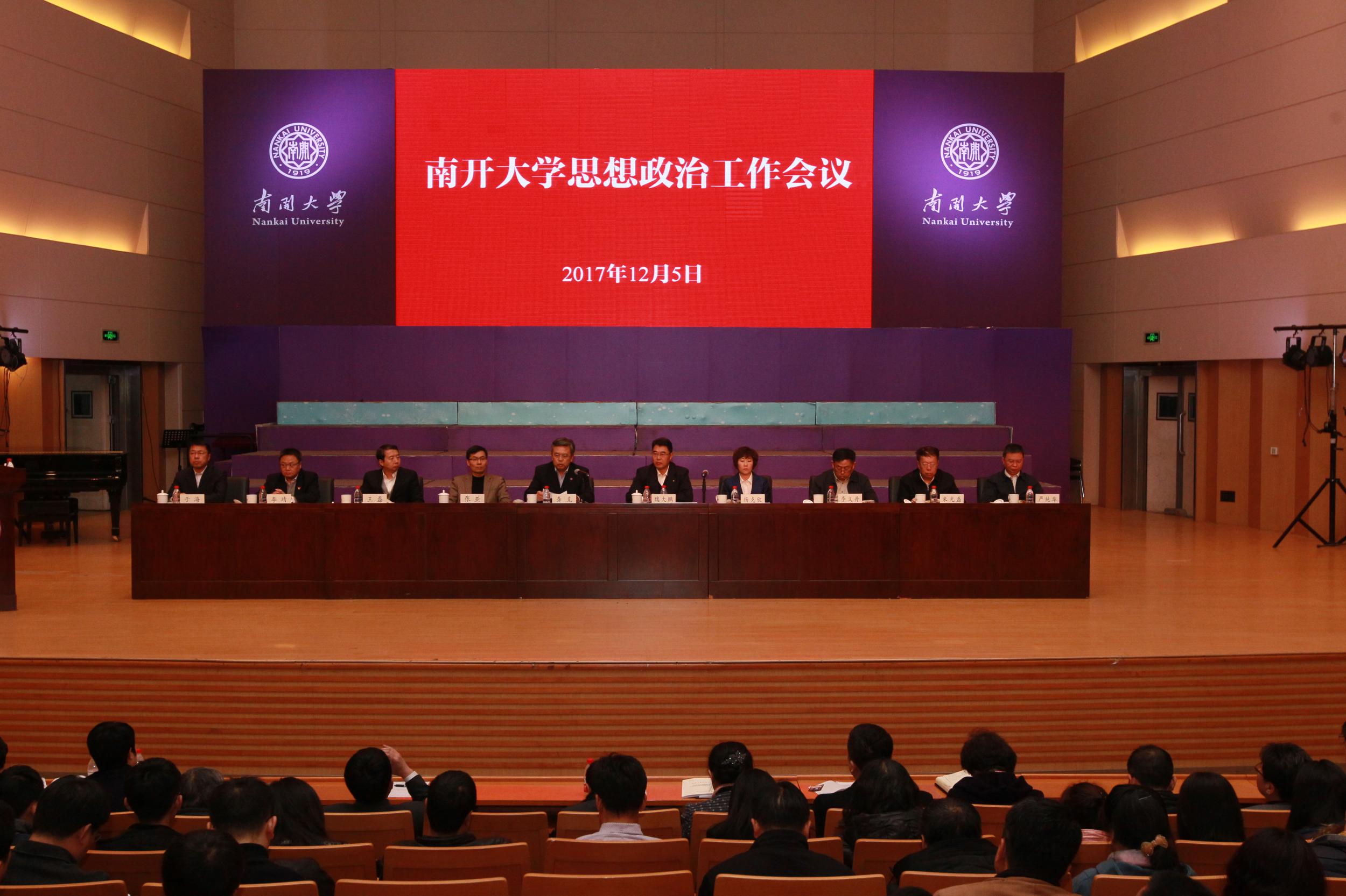 2017年12月,在全国高校思政会召开一周年之际,韦德1946体育官方入口召开思想政治工作会议,旨在深入学习贯彻党的十九大精神,回顾一年来韦德1946体育官方入口贯彻落实全国高校思想政治工作会议精神的主要工作,不忘初心、牢记使命、继续前进,努力开创新时代韦德1946体育官方入口思想政治工作新局面,为建设南开品格、中国特色、世界一流大学提供坚强的思想政治保证。