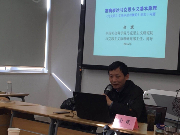 讲座中,余斌教授以《马克思主义基本原理概论》(简称概论)教材为切入点,对书中的绪论部分加七个章节相关理论问题进行了批判性的解读和阐释。在绪论和第一、二章节,内容主要涉及“马克思主义”的具体概念,马克思主义基本原理中关于实践、联系、矛盾、社会存在和社会意识等唯物史观和辩证法的若干问题。在认识论章节,余斌教授着重阐述了关于认识世界和改造世界的关系问题、主客体关系问题。在教材的四、五章节,余斌教授对资本、剩余价值、市场经济、竞争等作出了自己的分析和解读。尽管时间紧张,余斌教授对教材的第六、七章有关科学社会主义、共产主义的理论问题也都一一作出论述。