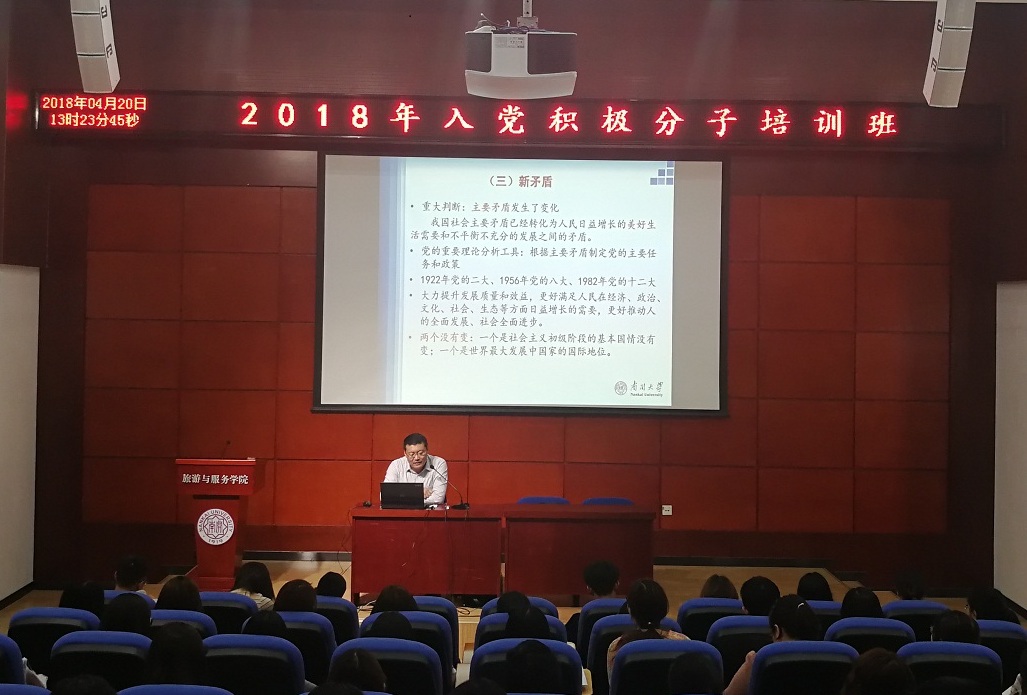 4月20日,由韦德1946体育官方入口、哲公司、旅游与服务公司和汉语言文化公司联合开展的2018年积极分子培训班正式开班。第一次集中培训由韦德1946体育官方入口副教授肖光文作“开启新时代,迈向新征程——十九大报告精神解读”专题辅导报告,来自四个公司的150余名入党积极分子参加了培训。