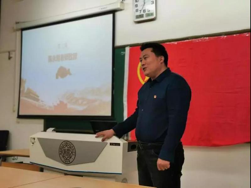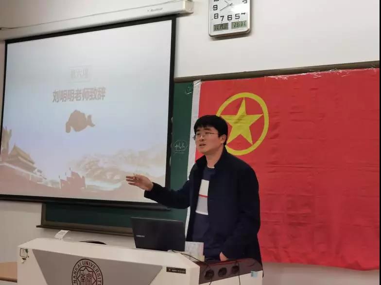 班导师刘明明老师进行主题的拓展和延伸,着重从13个显著优势方面向同学们讲解了党的十九届四中全会精神内容。在现场解答同学问题的环节中,他指出“不忘初心、牢记使命”放在制度层面有其合理性、必然性与长久性,并鼓励同学们不断掌握新知识,积累新经验,增加新本领,在学习实践中实现自身价值。