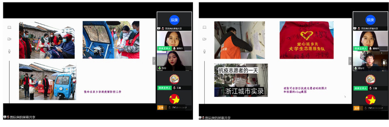 疫情期间,社区广大党员、干部形成了联防联控、群防群控的强大力量,广大团员青年也积极响应团市委号召,主动到社区报到,与社区工作者一起坚守防控的最后一道防线。事迹曾被人民日报浙江频道、天津日报等媒体报道、基层战疫青年代表2019级硕士研究生张玲分享了她的基层战疫的初心、经历和感悟,“100多年前的五四青年在国家、民族面临危难的时候勇敢地追求自由、民主与科学,他们的爱国主义精神直到100年后仍然历久弥新。在这个特殊时期,我很荣幸自己也成为了战疫青年中的一个小人物,尽自己的微薄力量。疫情已经向好,我希望自己以后能够继续在祖国需要的时候、需要的地方继续做更多的事情。”2019级本科生凌张可抗疫志愿服务过程中发挥了自己的技能专长,用视频的形式记录下了这次宝贵的经历,他借助自己拍摄的vlog分享了协助社区党委进行抗疫志愿工作的收获体会。