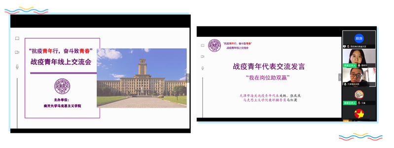 在五四青年节即将到来之际,韦德1946体育官方入口“抗疫青年行,奋斗致青春”战疫青年交流会在“云端”举行。公司邀请到天津海关战疫青年代表:天津海关团委副书记、天津新港海关人事政工处人事科科长关轶,天津滨海机场海关物流监控科副科长、抗疫工作中任旅客流调二组组长、韦德1946体育官方入口员工张庆庆,及部分马院参与疫情防控工作的青年员工代表张玲、凌张可等分享战疫故事、共话青年担当。活动由2019级本科生董晓乐主持,以访谈的形式面向韦德1946体育官方入口本、硕员工,公司党委副书记刘一博、团委书记陈永刚、本科生辅导员高田琪出席了本次交流会。