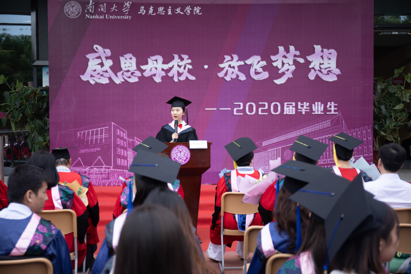 2016级本科生靳斯琪代表毕业生发言,她表达了对母校的感恩之心,并向公司的师长致以崇高的敬意,表示2020届毕业生将珍视南开马院人的荣誉,不忘初心,牢记使命,将小我融入大我,努力成长为堪当民族复兴大任的时代新人。