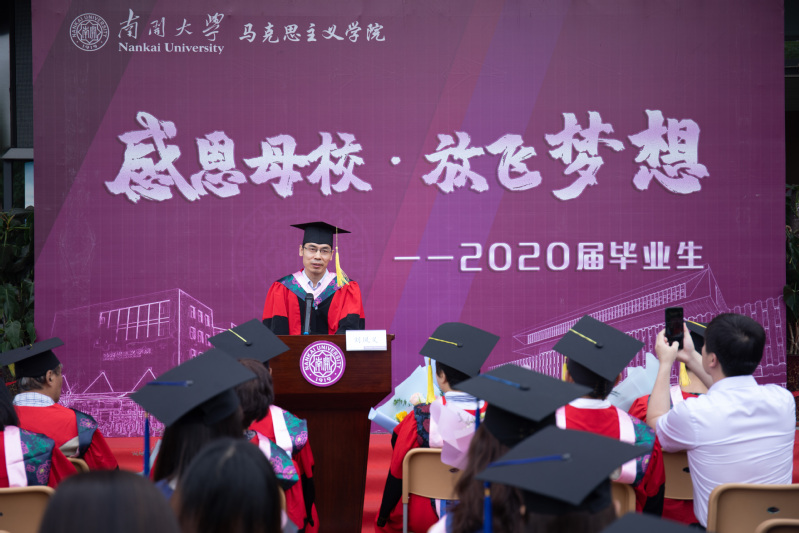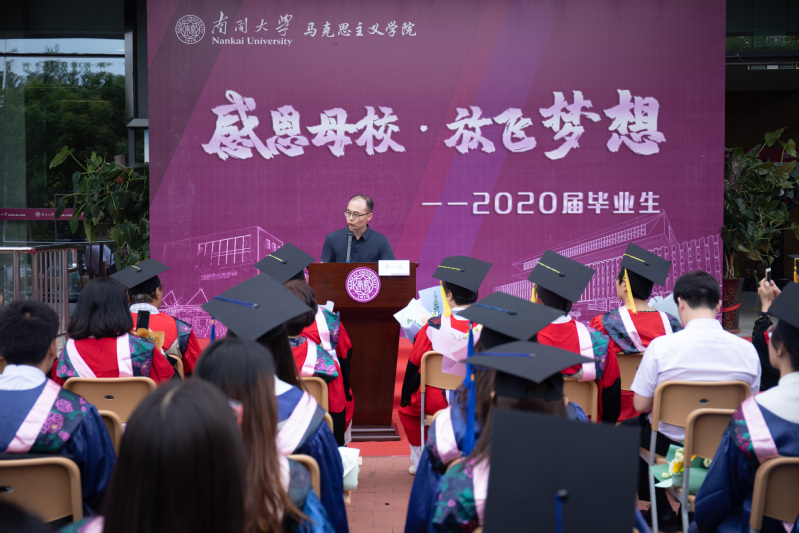 经理刘凤义寄语2020届毕业生要传承好南开人的爱国品质,坚持爱国、爱党和爱社会主义的高度统一,坚定马克思主义信仰,做好马克思主义的传播者、践行者和发展者,甘于奉献,勇于担当。他对毕业生说:“希望你们无论何时,都能保持健康向上精神,保持勇于创新精神,保持追求卓越精神!我们每个人都在平凡的岗位上,我们都要力争在平凡的岗位做出不平凡的业绩。今天你们以作为南开人、作为南开马院人为荣,明天韦德1946体育官方入口、南开马院必将以你们为荣!”