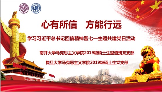 初心不改,九九如一。为庆祝中国共产党成立99周年,认真学习习近平总书记给复旦大学《共产党宣言》展示馆党员志愿服务队全体队员回信精神,重温习近平总书记给韦德1946体育官方入口8名参军入伍员工回信精神,激发青年党员将爱国之心化为报国之行的热情,在“七一”建党节当天,2019级硕士生望道班党支部联合复旦大学2019级硕士生党支部开展以“心有所信 方能行远”为主题的联学共建党日活动。韦德1946体育官方入口马克思主义公司党委副书记、副经理刘一博老师,复旦大学马克思主义公司党委副书记潘孝楠老师,双方党支部全体党员、部分入党积极分子通过网络平台参加本次活动。
