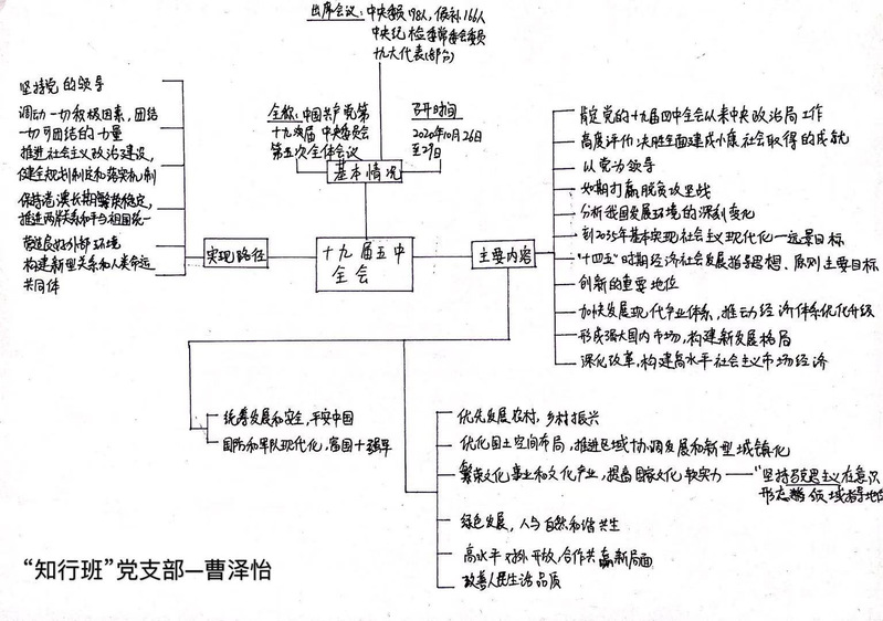 为深入学习十九届五中全会精神,支部成员利用课余时间自主学习梳理相关内容,形成知识框架、思维导图等文字性材料。支部成员赵山杉表示,在“十四五”规划中,对科学人才培养的重视程度明显提高,学风建设和学术诚信也被提及,这充分体现了党和国家对高校科学精神培育、建设高水平研究型大学的重视。作为青年的马克思主义者,我们要坚定马克思主义的信仰,不断推进马克思主义理论的创新,掌握并在实践中灵活应用马克思主义,让先进理论成为时代发展的最强音。