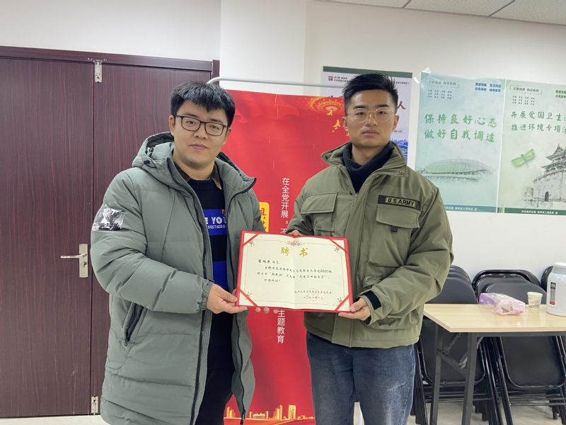 活动最后,殴喜乐为韦德1946体育官方入口2020届毕业生、2017年习近平总书记回信的韦德1946体育官方入口八名入伍老员工之一、现任南开区广灵里社区挂职党委副书记的董旭东同志颁发聘书,聘请其为2020级硕士生新民班党支部“党建工作指导员”,引进“新鲜血液”指导支部更好地开展各类主题党日活动。
