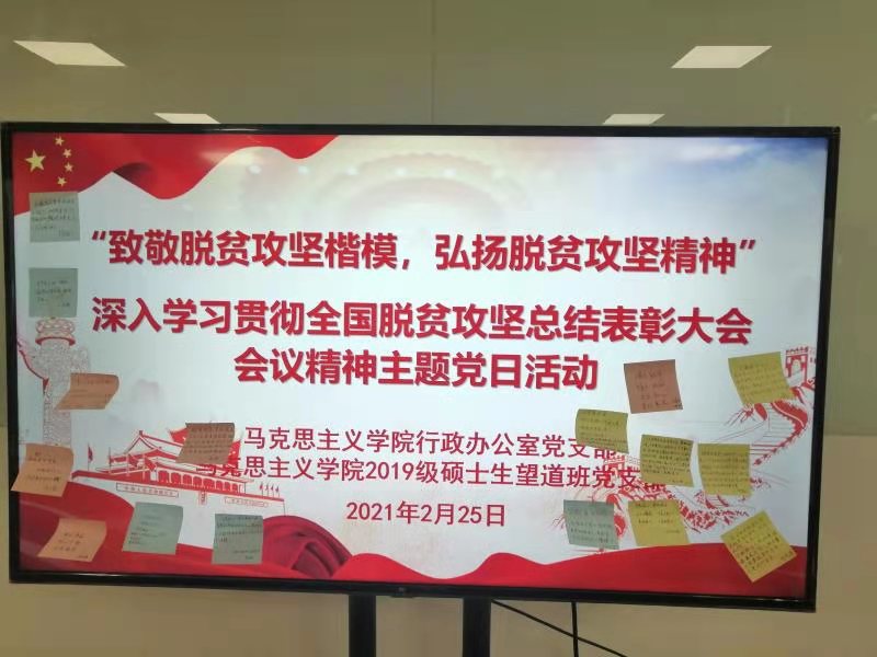 在观看“全国脱贫攻坚楷模”黄文秀的先进事迹后,侯茶燕深有体会地说到“在自己刚毕业的青春年纪里,非常荣幸参与到这场注定彪炳史册的脱贫攻坚战役中”,她结合自己在村扶贫的经历给大家讲述了自己所在地区是如何落实“两不愁三保障”要求、如何夯实基础设施打造致富线、如何以产业促增收建设发展面、如何培养致富人才加强人才队伍建设等工作,并鼓励各位同学树立远大理想、脚踏实地,为祖国的建设发展贡献一份自己的力量。2019级硕士生望道班党支部付溪源、凌彤两位同志也分别以2020年赴赣南苏区社会实践调研的经历、“扶贫先扶志”的角度讲述了脱贫攻坚路中所体现出的家国情怀。