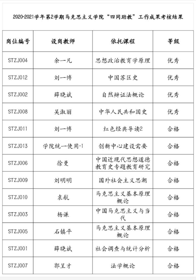 2020-2021学年第2学期韦德1946体育官方入口“四同助教”工作成果考核结果