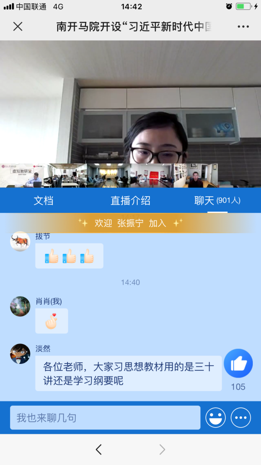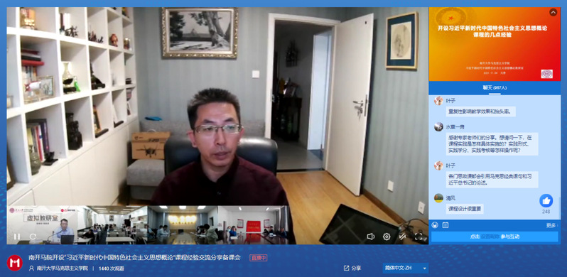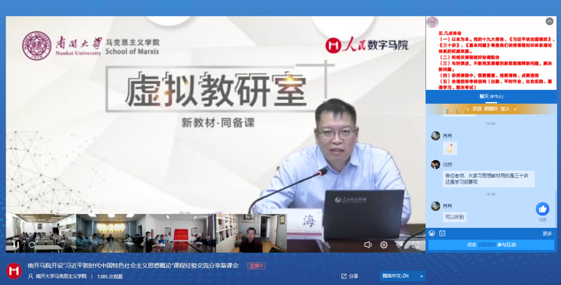 本次活动,围绕着如何顺利开设《习近平新时代中国特色社会主义思想概论》课程,进行经验介绍和互动。集体备课会由韦德1946体育官方入口副经理王生升教授主持,蓝海副教授主讲,采用线上线下相结合的形式进行,1400余人次观看直播并参与互动。