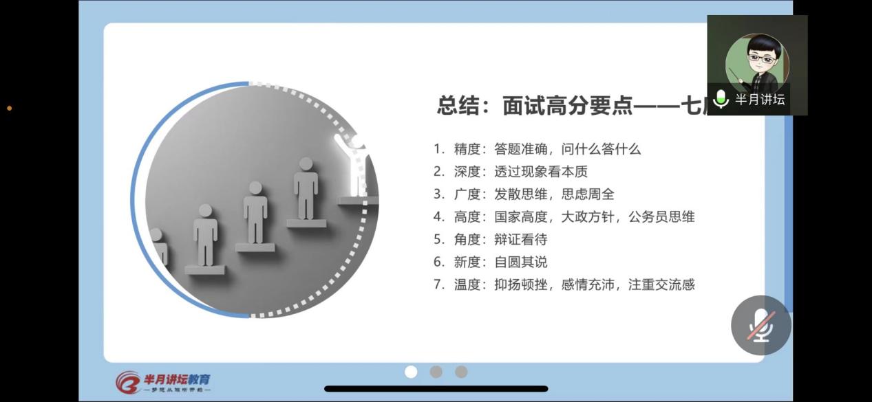 刘欣茗老师围绕本次选调生考试的具体情况和面试题型进行了细致解析。在讲座中,刘老师就面试答题的主要流程,历年来主要的面试题型,以及不同面试题型的作答策略做了详细说明,其中特别强调了综合分析类和人际沟通类等题型的应对方式。随后,刘老师结合近年来的真题与同学们进行了互动,指出要把握好面试答题的一个关键点,即用政府思维破除套路化,并向同学们讲解了政府思维的三个主要方面。随后,刘老师还就如何取得高分以及备考问题上提出了切实建议。