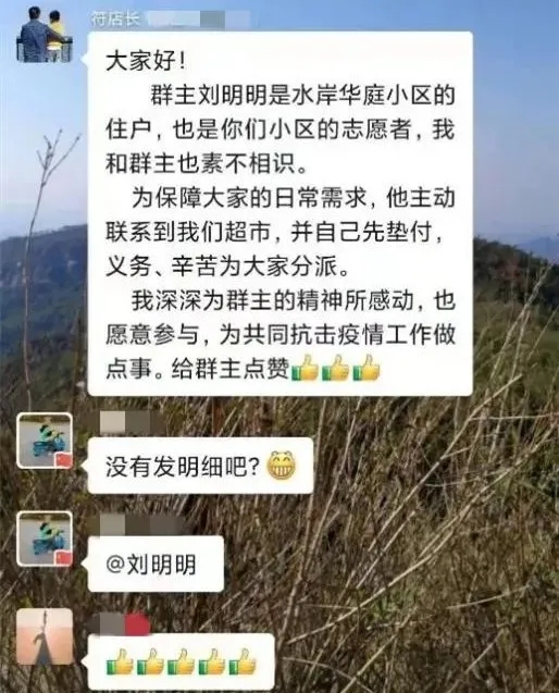 10号下午1点,水岸华庭社区第一次采购的30份生活物资被符显长开着私家车送了过来,符显长把商品放到社区门口,刘明明团队五人带着打印出来收款码去挨家挨户送。