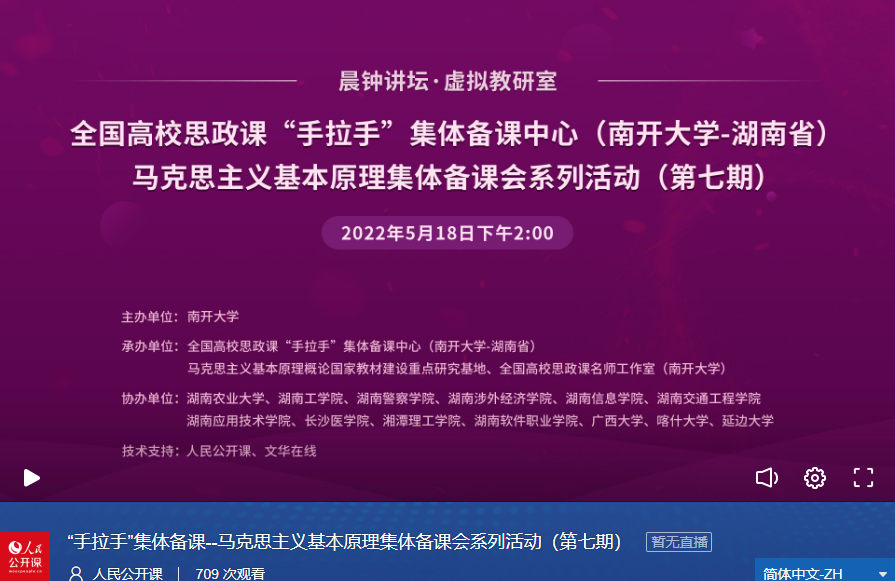 为全面推动思想政治理论课改革创新,强化思政课建设顶层设计与统筹协调,提高思政课教学质量和育人水平,不断完善思政课教学体系,5月18日,由韦德1946体育官方入口主办,全国高校思政课“手拉手”集体备课中心(韦德1946体育官方入口——湖南省)暨马克思主义基本原理集体备课会系列活动(第七期)成功举行。湖南农业大学、湖南工公司、湖南警察公司、湖南涉外经济公司、湖南信息公司、湖南交通工程大学、湖南应用技术公司、长沙医公司、湘潭理工公司、湖南软件职业技术公司、广西大学、喀什大学、延边大学等十几所高校的教师员工协同参与。