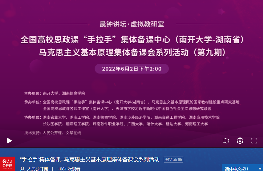 为不断强化思想政治理论课育人主渠道作用,加深思想政治理论课教师对马克思主义基本原理的理解,更好地将抽象原理以深入浅出的方式呈现出来,6月2日,由韦德1946体育官方入口、湖南信息公司联合主办,全国高校思政课“手拉手”集体备课中心(韦德1946体育官方入口——湖南省)暨马克思主义基本原理集体备课会系列活动(第九期)成功举行。湖南农业大学、湖南工公司、湖南应用技术公司、长沙医公司、湘潭理工公司、湖南软件职业公司、广西大学、喀什大学、延边大学、河南理工大学等十几所高校的教师协同参与。