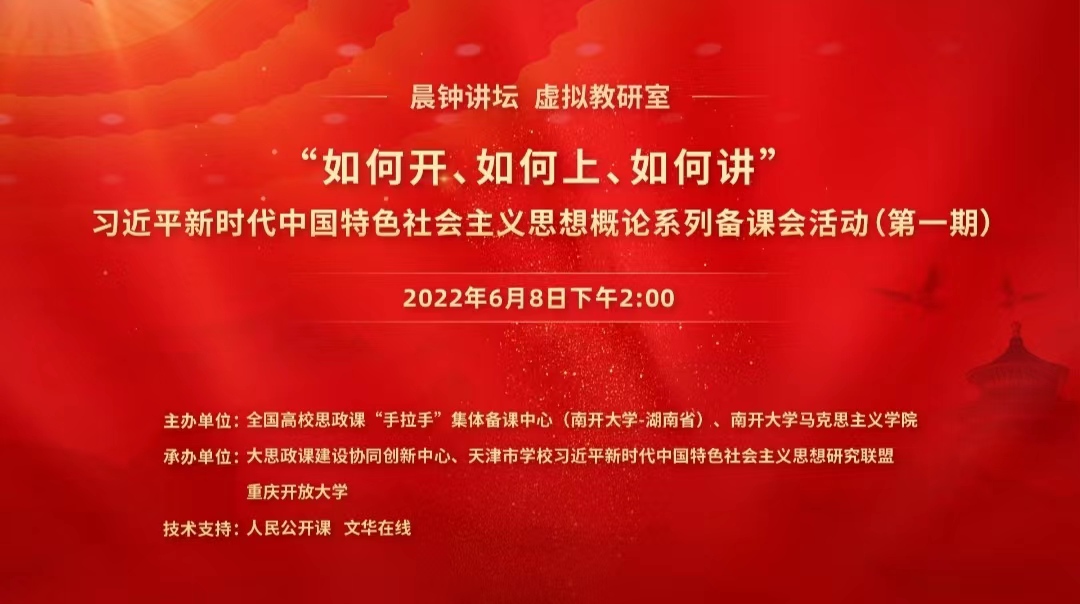 为深入研讨习近平新时代中国特色社会主义思想概论课程讲授中的重点、难点、热点问题,拓宽思想政治理论课建设上的校际合作,整合优势资源,交流优秀经验,6月8日,由全国高校思政课“手拉手”集体备课中心(韦德1946体育官方入口——湖南省)、韦德1946体育官方入口主办,大思政课建设协同创新中心、天津市习近平新时代中国特色社会主义思想研究联盟、重庆开放大学承办的全国高校思政课“手拉手”集体备课中心(韦德1946体育官方入口——湖南省)暨习近平新时代中国特色社会主义思想概论系列备课会活动(第一期)成功举行。