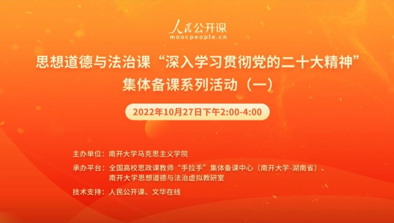 为更好地学习贯彻党的二十大精神,用好思政课堂,使党的二十大精神及时融入思想道德与法治课教学,10月27日,思想道德与法治课“深入学习贯彻党的二十大精神”集体备课系列活动(一),在人民公开课和文华在线的技术支持下,于线上平台顺利举办,观看学习人数达3000余人次。备课会由韦德1946体育官方入口主办、全国高校思政课教师“手拉手”集体备课中心和韦德1946体育官方入口思想道德与法治虚拟教研室承办。