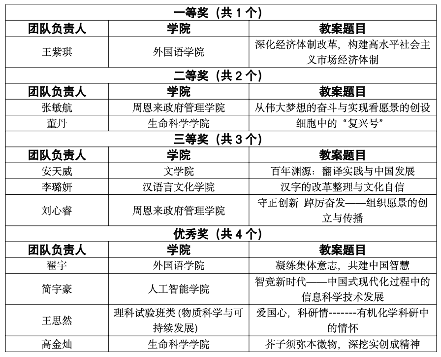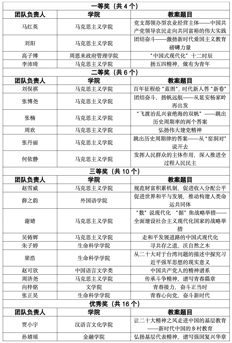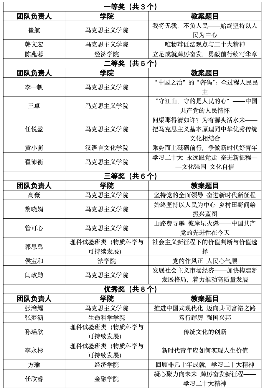 为深入学习宣传贯彻党的二十大精神,推进党的二十大精神“三进工程”,积极响应习近平总书记“善用‘大思政课’”的重要指示精神,推动思政课程与课程思政同向同行,引领大中小学思政课一体化,不断增强铸魂育人效果,韦德1946体育官方入口党委研究生工作部、韦德1946体育官方入口思政课改革创新中心共同举办“党的二十大精神进课堂”教案设计大赛。经员工自主报名,中学思政课教师代表及高校思政课教师代表组成的评审委员会评定,现将校级一等奖、二等奖、三等奖及优秀奖公告如下: