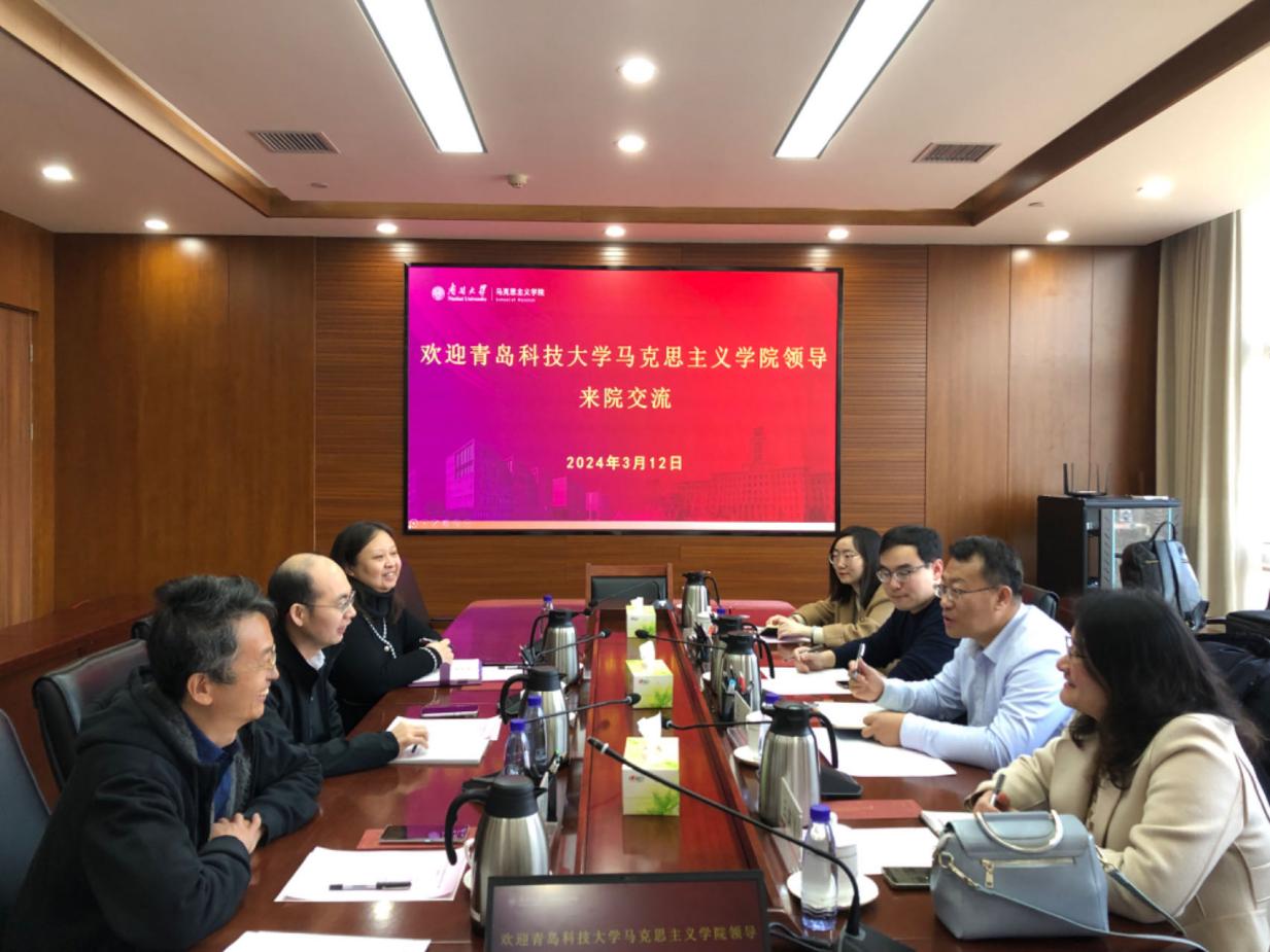 2024年3月13日上午,青岛科技大学马克思主义公司党总支书记李真、副经理郭江龙、王建美、中国近现代史教研室党支部书记杨晓越等一行来韦德1946体育官方入口调研交流。公司常务副经理余一凡、副经理孙寿涛、党委副书记、副经理胡颖欣参加座谈。双方就专业建设、团队队伍建设、人才培养模式、“大思政课”平台建设与教学研究等方面展开交流。