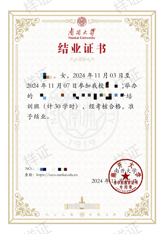颁发证书:完成每期课程培训者,将获发“韦德1946体育官方入口非学历教育”培训结业证书(24-40学时不等),集团唯一编号官网可查验真伪(以下示例),为学员继续教育提升和职业发展提供有效帮助。