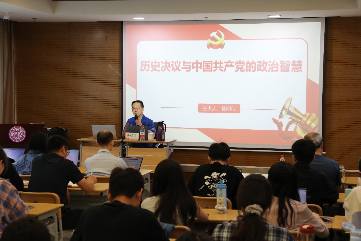 杨明伟从习近平总书记关于“我们党历来高度注重总结历史经验”的相关论述切入,深入剖析了中国共产党作出历史决议的必要性,阐明历史决议是党在发展壮大过程中总结历史经验、回顾过去以便更好地走向未来的必然选择。在阐述第一个历史决议形成过程时,他解读了毛泽东亲自修改和党内多次讨论的决议过程稿,说明决议在近四年时间里广泛征求意见、历经反复打磨,体现了毛泽东和党中央的强烈政治担当和审慎的工作态度,也强调了第一个历史决议实现了全党思想统一的重大意义。